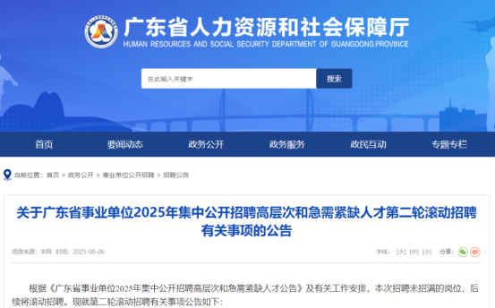 8月6日《关于广东省事业单位2025年集中公开招聘高层次和急需紧缺人才第二轮滚动招聘有关事项的公告》正式发布(链接:https://hrss.gd.gov.cn/zwgk/sydwzp/zpgg/content/post_4754992.html)。