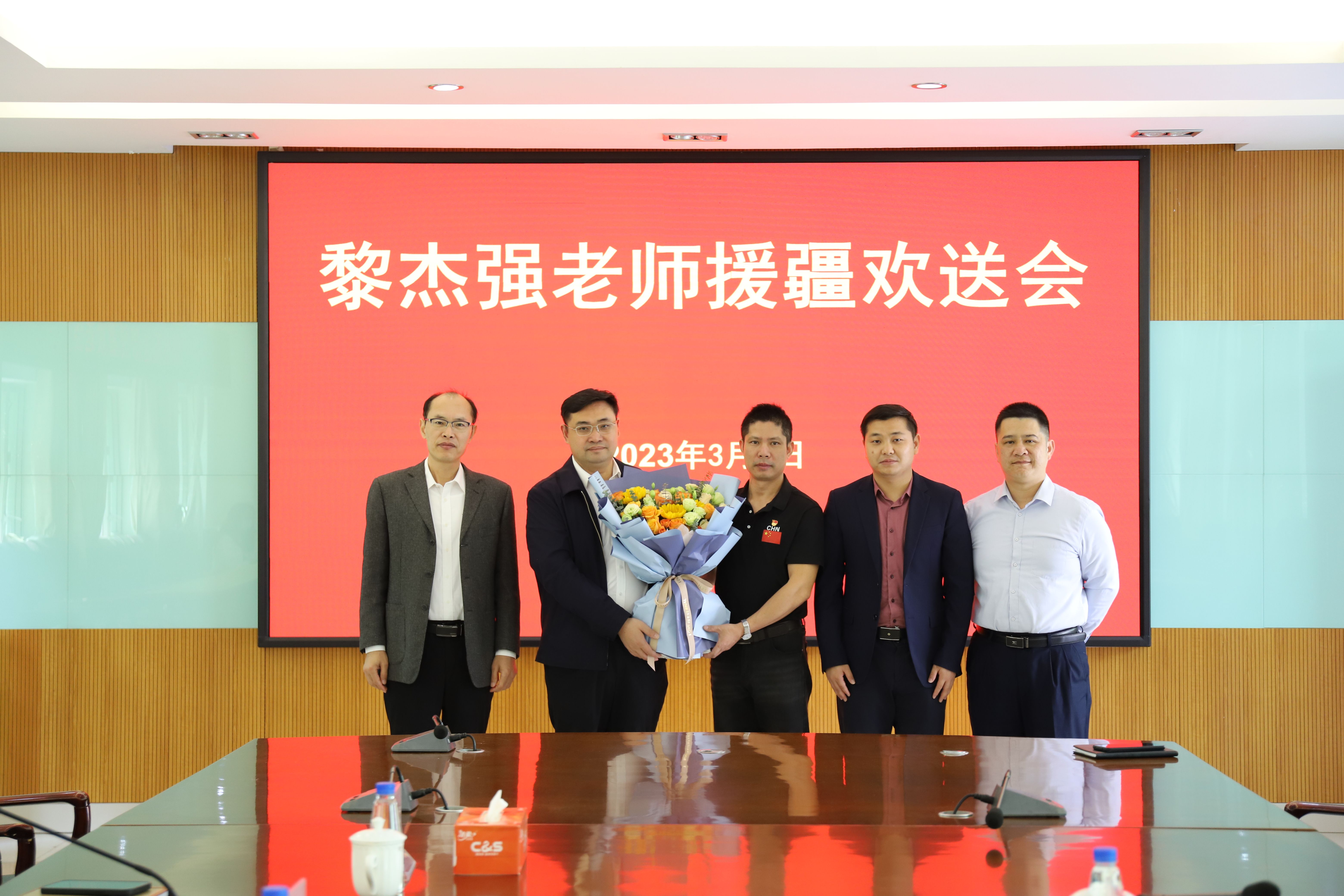 欢送会上,黎杰强老师深情表示,此次援疆意义重大,肩负进驻兵团、立足教务、构建课程体系和管理体系的重任,面临环境陌生、条件艰苦的困难,但他有信心、有热情,此次援疆对他而言绝不是一个人的战斗,而是要代表广东、代表中山、代表学院;不是单纯的帮扶,更重要的是产业扶持,一定会努力促进双方在竞赛、师生等多方面的沟通交流,体现团队援疆的力量,亮出中山品牌、学院品牌!