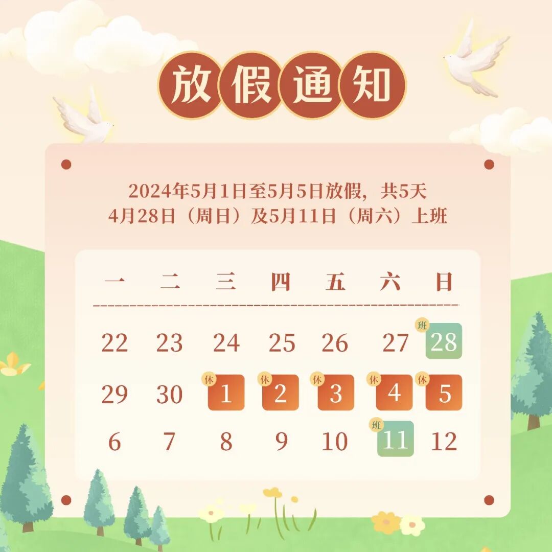 根据《国务院办公厅关于2024年部分节假日安排的通知》(国办发明电〔2023〕7号)文件精神,结合我院实际,5月1日(星期三)至5月5日(星期日)为国际劳动节假期,4月28日(星期日)补上5月2日(星期四)、5月11日(星期六)补上5月3日(星期五)的课。学生于4月27日(星期六)返校正常晚修、5月5日(星期日)返校正常晚修。