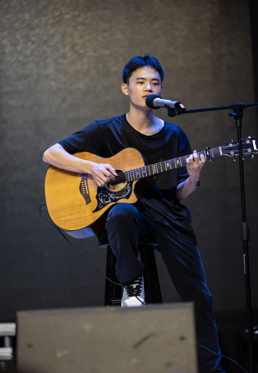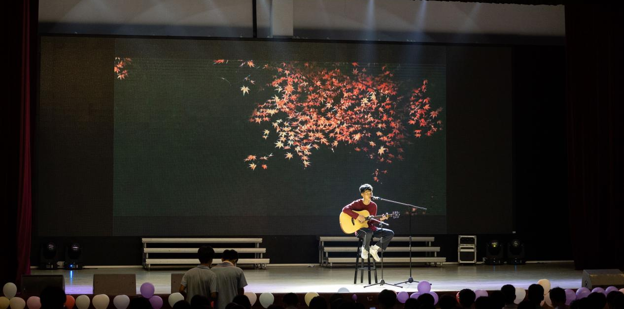 204新能源512班罗友亮带来吉他弹唱《妈妈的话》,唱出了对母亲的感恩,也表达了对母校的感谢。