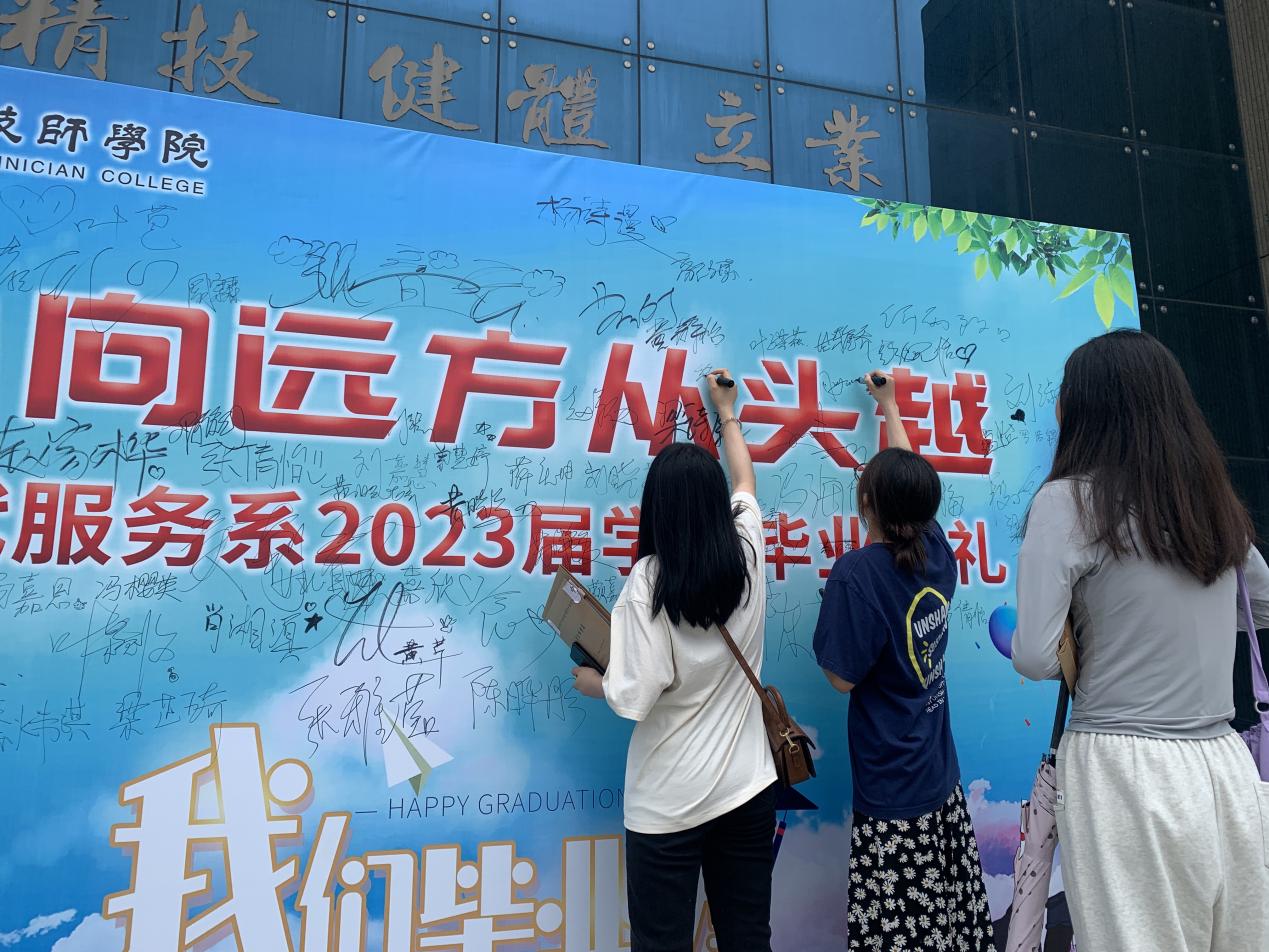 毕业典礼结束后,同学们纷纷在毕业墙签上自己的名字,合影留念。