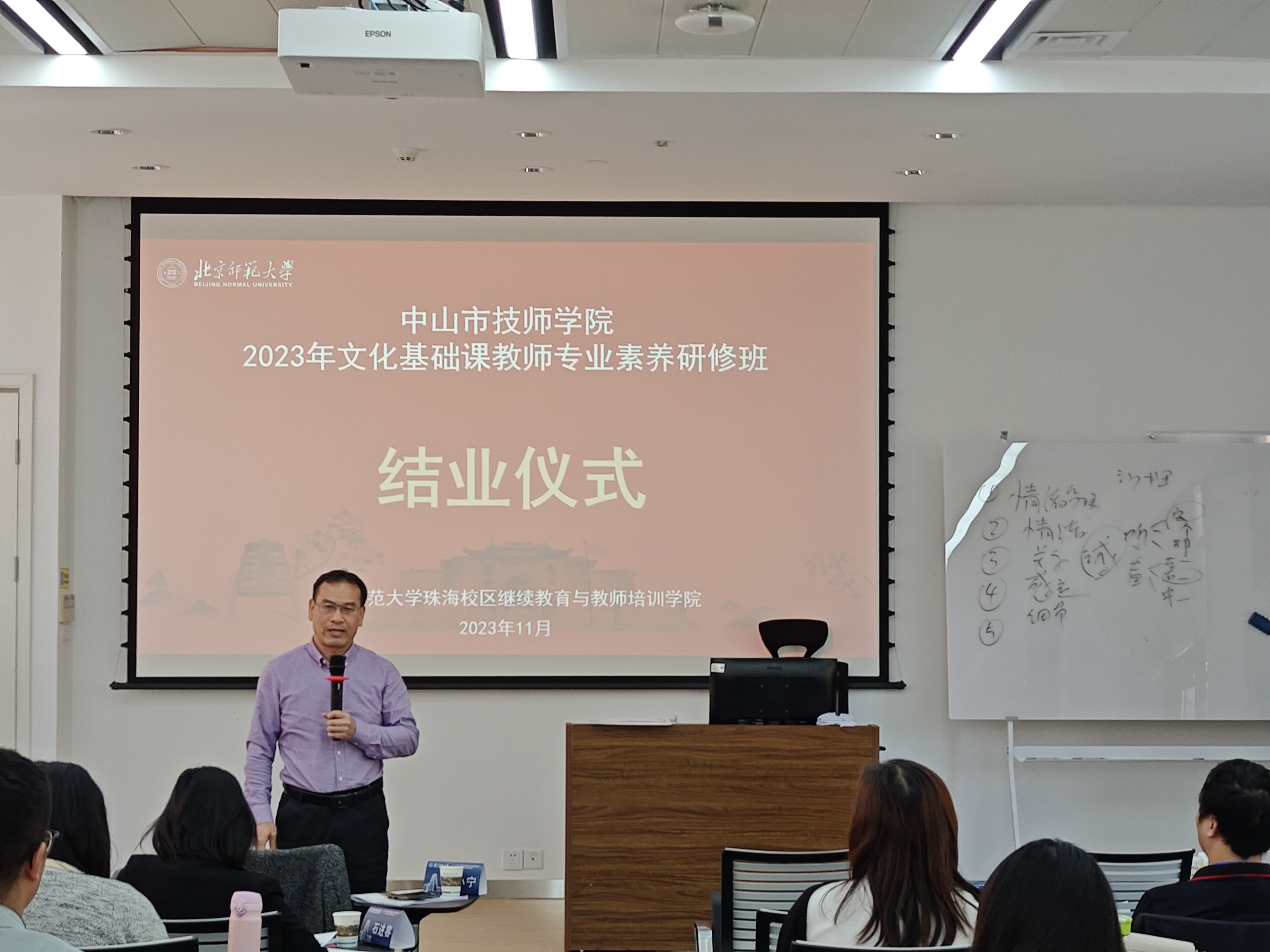 开班典礼上,北京师范大学珠海校区继续教育与教师培训学院顾问、老院长吴圣谷对北师大、北师大珠海校区的发展历史、办学规模、师资力量及未来展望作了详细介绍。我院党委委员温小宁对本次研修学习作了动员讲话,希望大家能“学有所悟,悟有所得”。
