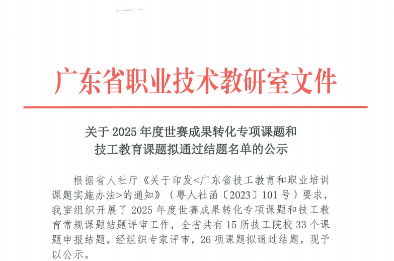 近日,2025年度世界技能大赛成果转化专项课题及技工教育常规课题结题评审会在广东省轻工业技师学院举行。中山市技师学院申报的三项世赛成果转化省级重点课题全部顺利通过评审,成果喜人。