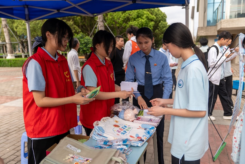 综合楼广场上,“薇光成炬 与法同行”互动体验区热闹非凡。“解忧驿站”“感同身受”“青春不越界”“求助我有法”“穿越法网”等五个主题摊位游戏,将法律知识融入趣味互动中,学生在集章兑奖的过程中寓教于乐,现场气氛热烈。