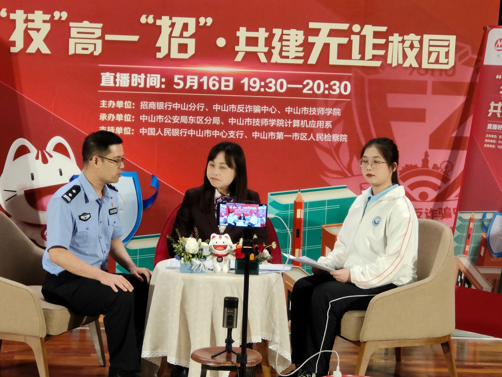 2022年5月16日晚,在我院东校区报告厅举行了“技高一招,共建无诈校园”校园反诈宣传直播活动,本次活动由中山市技师学院、