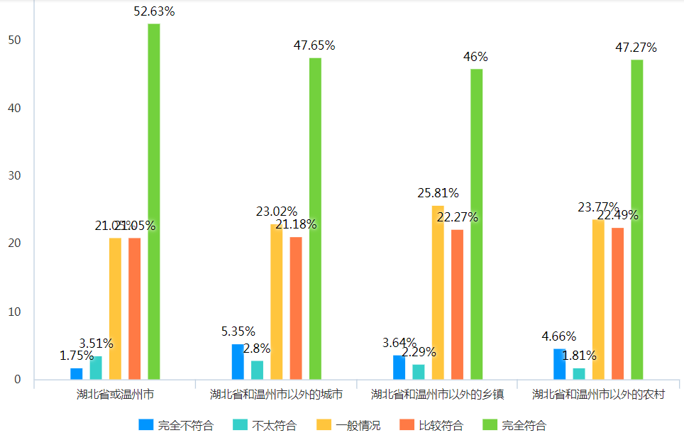 当被问及“对开学是否充满担心和焦虑”时,选择“完全符合”、“比较符合”及“一般情况”三个选项均表示学生对开学存在不同程度的焦虑感。累计三个选项概率可知:59.65%居住于湖北省或武汉市的学生对开学存在焦虑感;52.73%、50.33%及51.97%居住于湖北省和温州市以外城市、乡镇和农村的学生对开学存在焦虑。因此,我们可以得出:有更多居住于湖北省或温州市重点疫区学生对开学充满焦虑。