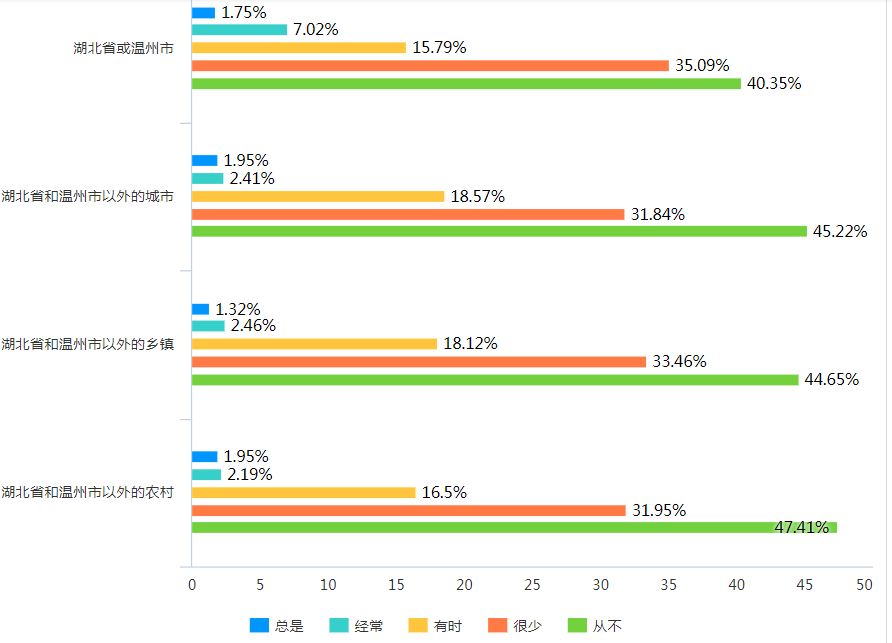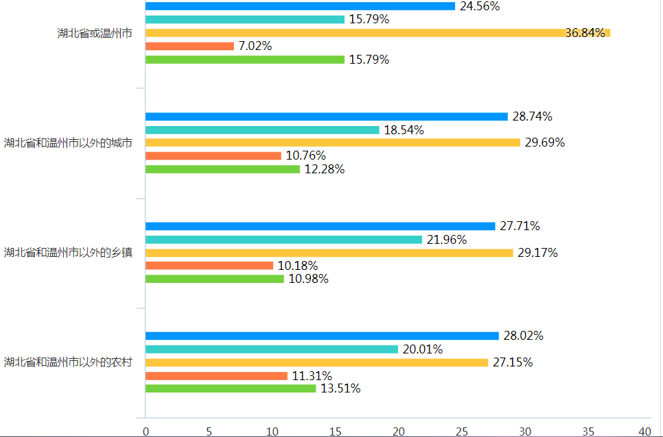 以“学生疫情期间居住地”为自变量,以“学生是否希望早日开学”为因变量进行分析,分析结果显示:当被问及“是否希望学校早日开学时”,居住湖北省或温州市的学生选择“完全符合”选项的概率是52.63%;居住与非重点疫区城市、乡镇和农村学生选择“完全符合”选项的概率分别是47.65%、46%和47.27%。因此,我们可知:居住于湖北省或温州市的学生更希望早日开学。其实这不难理解,重点疫区学生被隔离程度更高,对生活的可控感更低。重点疫区学生更希望走出家门,学校早日开学。