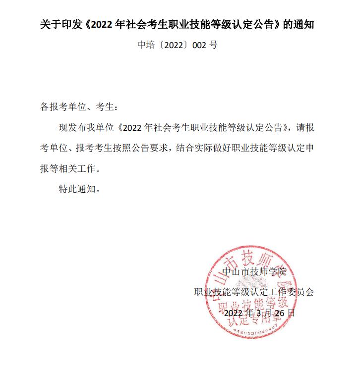 关于印发《2022年社会考生职业技能等级认定公告》的通知