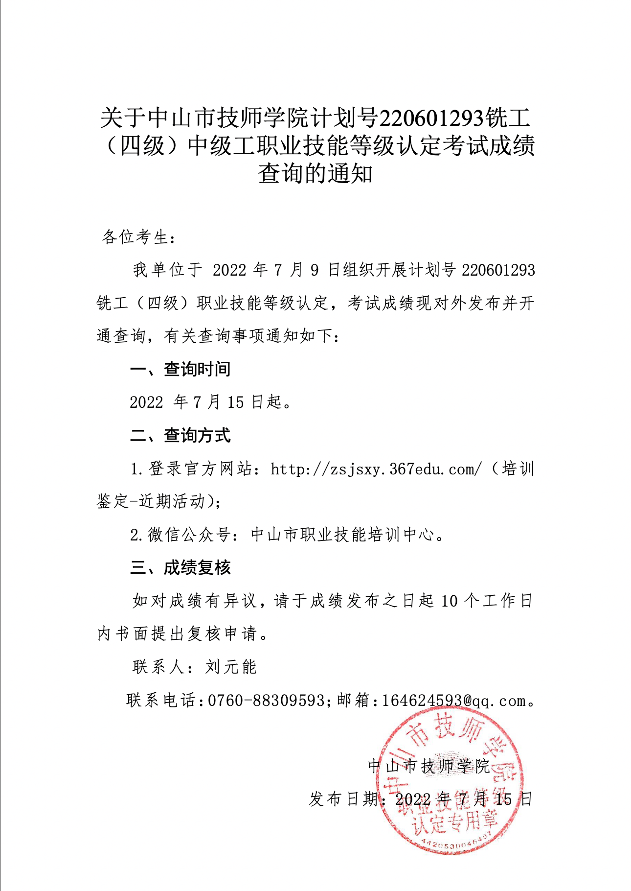 关于中山市技师学院计划号220601293铣工(数控铣床)四级职业技能等级认定考试成绩查询的通知