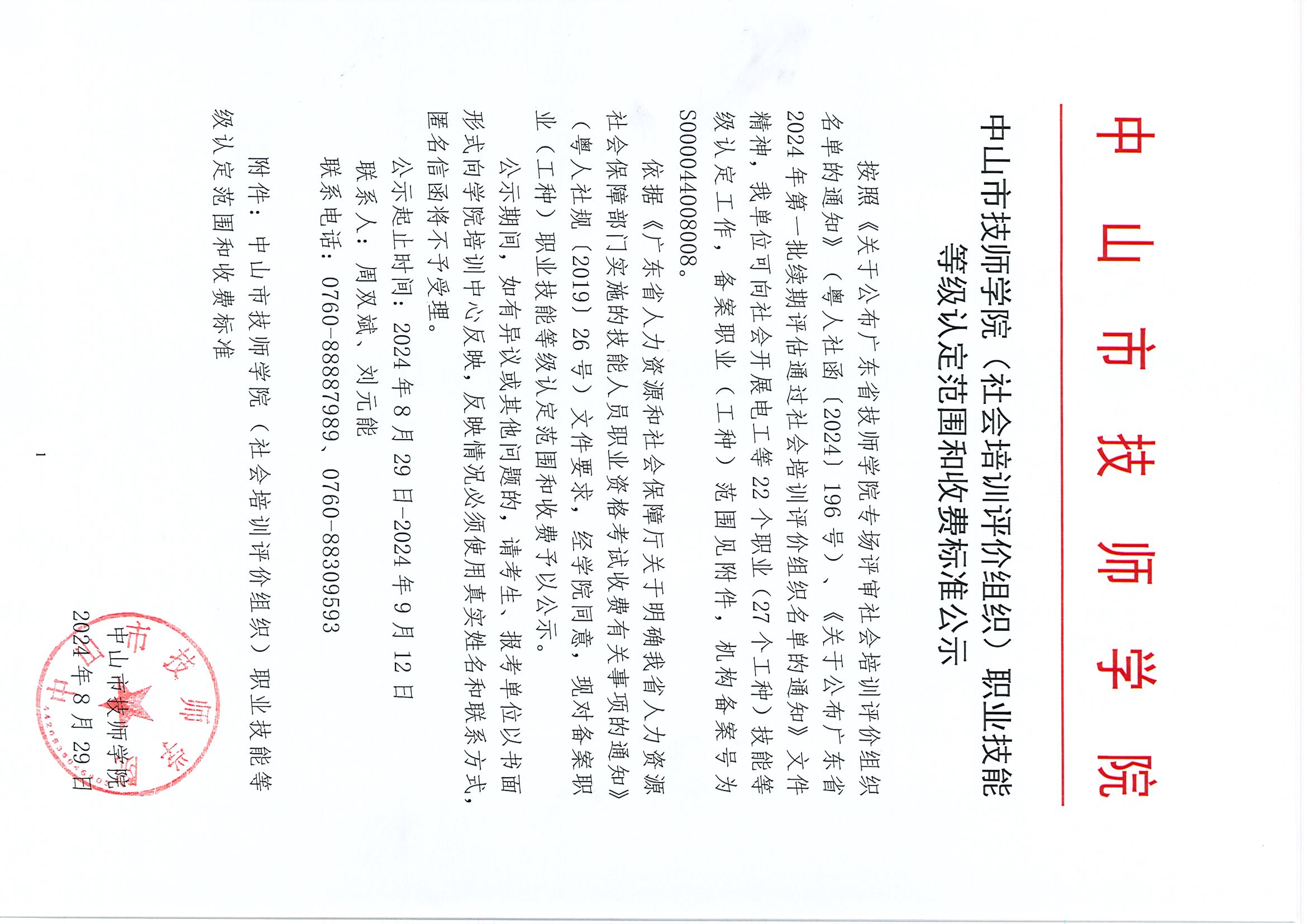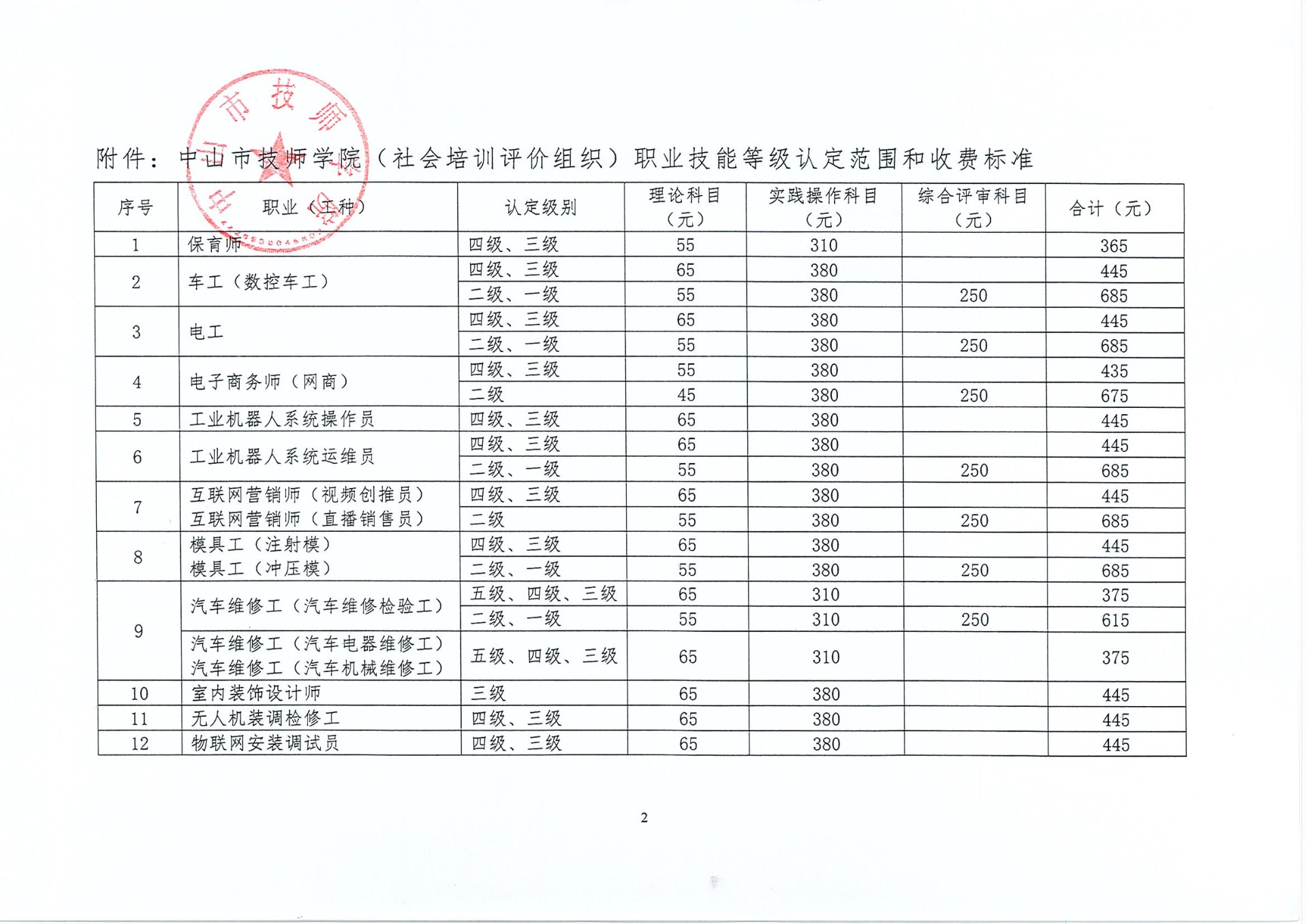 中山市技师学院(社会培训评价组织)职业技能等级认定范围和收费标准公示