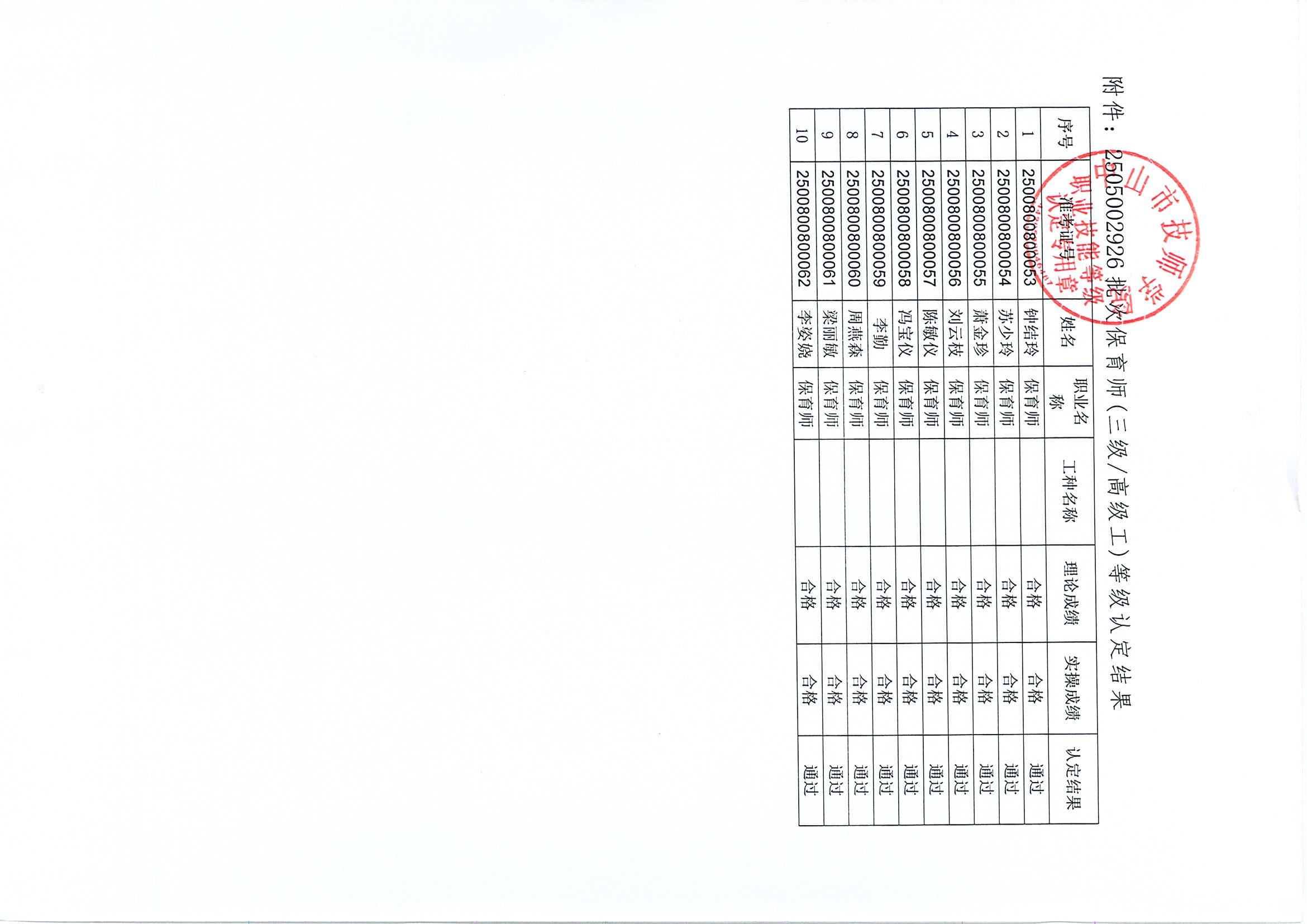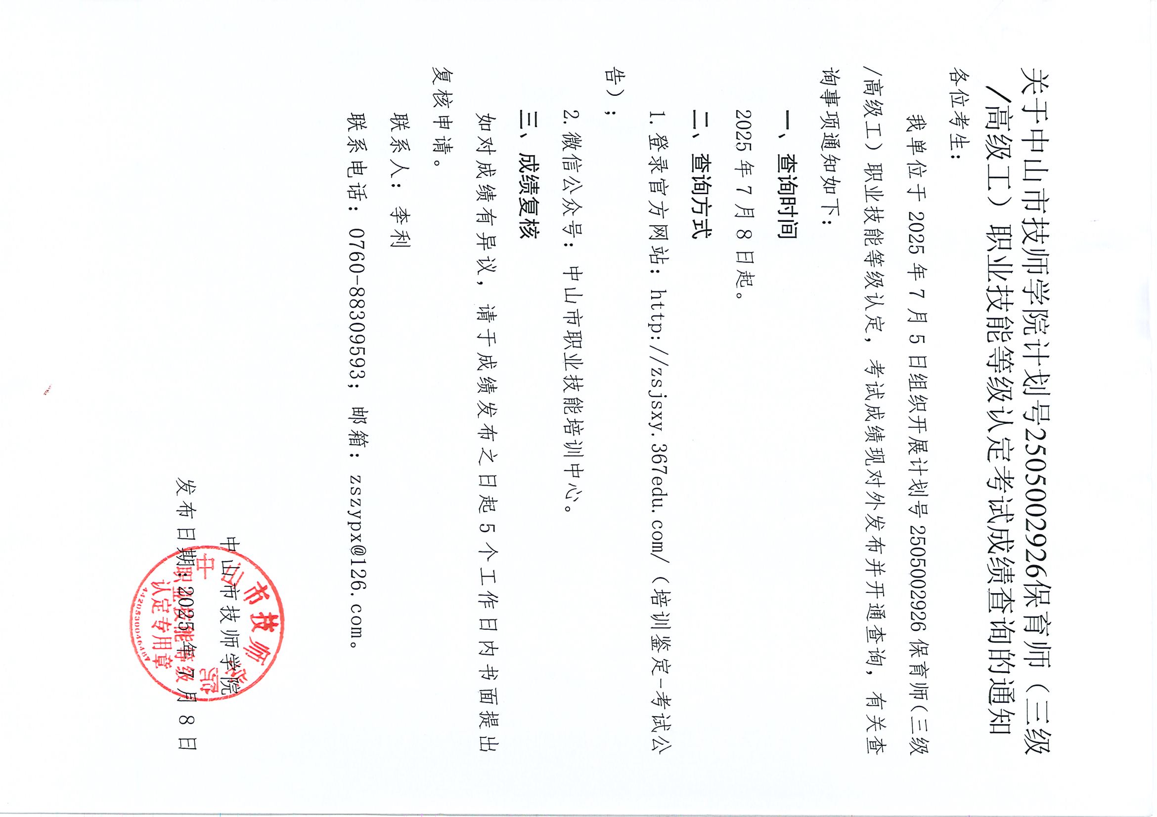 关于中山市技师学院计划号2505002926保育师(三级/高级工)职业技能等级认定考试成绩查询的通知