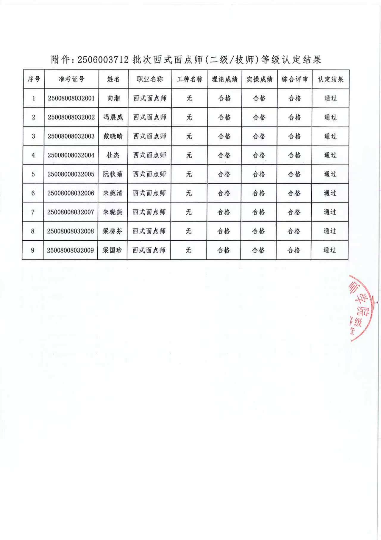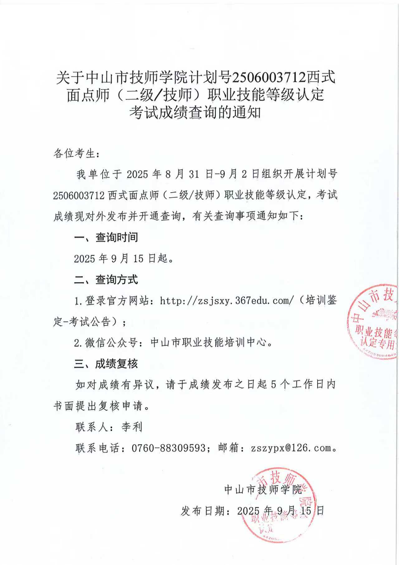 关于中山市技师学院计划号2506003712西式面点师(二级/技师)职业技能等级认定考试成绩查询的通知